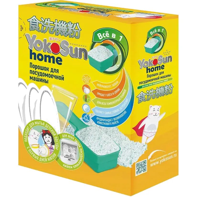 Порошок для посудомоечной машины YokoSun. Специально разработан для домашних посудомоечных машин всех типов. Эффективно и деликатно удаляет самые стойкие загрязнения при любых температурных режимах, не оставляя разводов на поверхности посуды и неприятного запаха. Включает в себя все функции All in 1.