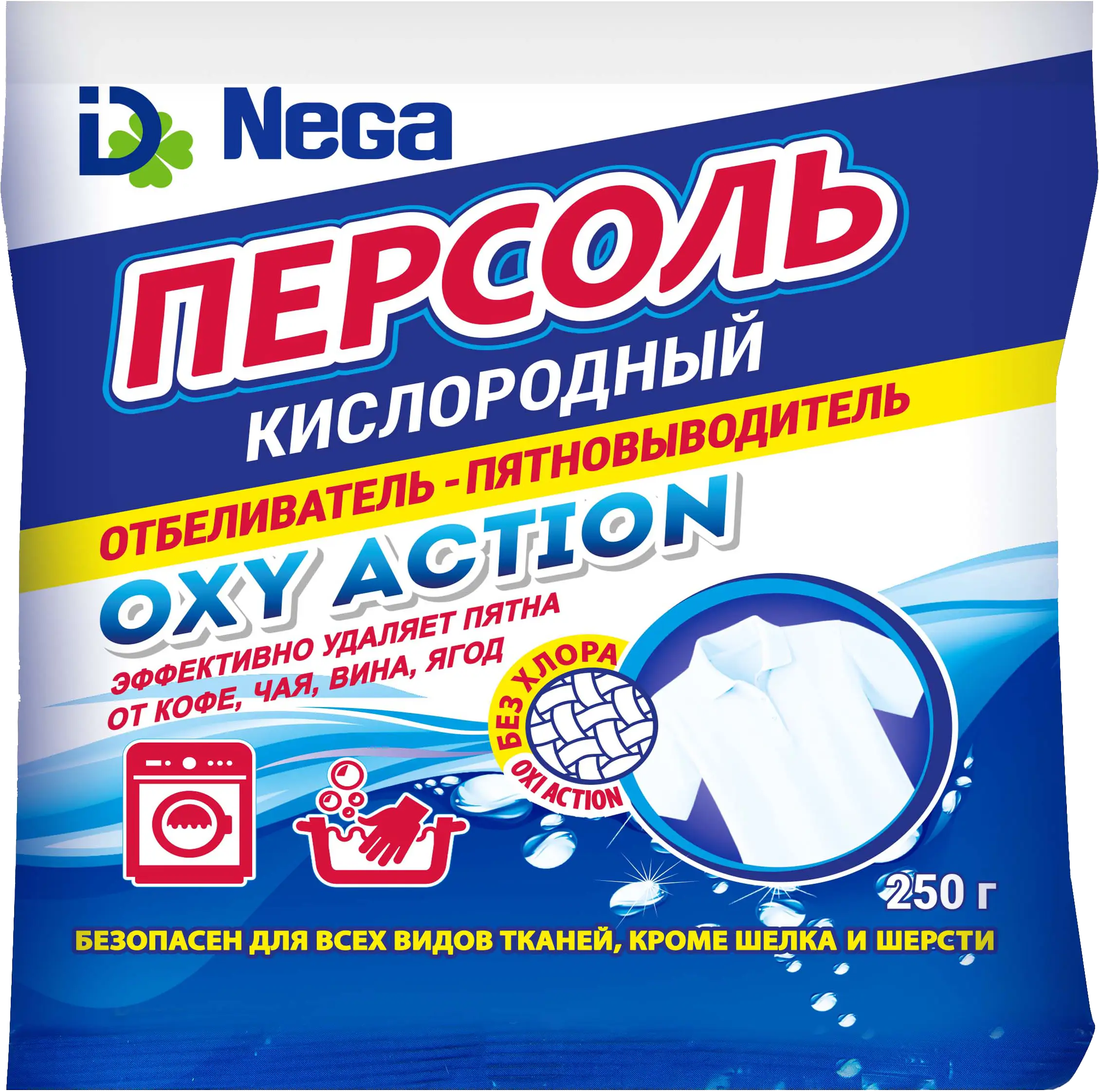 Nega отбеливатель Персоль удаляет пятна на всех видах тканей при стирке в автоматических стиральных машинках и в ручную. Отбеливает белые ткани, освежает окраску цветных тканей. Эффективно удаляет широкий спектр пятен: чай, кофе, вино, кровь, ягоды, фрукты и пр. Усиливает действие стирального порошка, улучшает качество стирки.