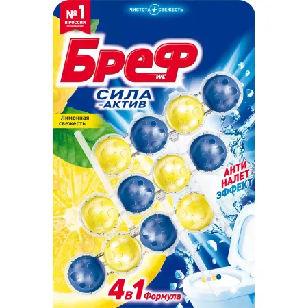 Чистящее средство для унитаза Bref Сила Актив «Лимонная свежесть» - это подвесной туалетный блок с формулой 4 в 1, который обеспечивает:
