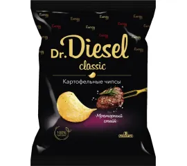 Рады вам презентовать премиальную линейку тончайших хрустящих ломтиков чипсов из 100% натурального картофеля «Dr.Diesel»! Чипсы производятся на самом крупнейшем ультрасовременном заводе в России, а собственная селекция картофеля «чипсовых» сортов гарантирует непревзойденное качество продукции. Создано для истинных гурманов, готовых открыть новые горизонты вкуса. Для истинных ценителей мы приготовили чипсы со вкусом мраморного стейка. Сочное мясо с ароматом барбекю и щепоткой перца в сочетании с нежной и хрустящей текстурой картофеля, perfecto!
