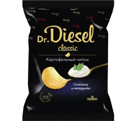 Рады вам презентовать премиальную линейку тончайших хрустящих ломтиков чипсов из 100% натурального картофеля «Dr.Diesel»! Чипсы производятся на самом крупнейшем ультрасовременном заводе в России, а собственная селекция картофеля «чипсовых» сортов гарантирует непревзойденное качество продукции. Создано для истинных гурманов, готовых открыть новые горизонты вкуса. Чипсы со вкусом сметаны и петрушки, ммм... Освежающие ноты и гармония!