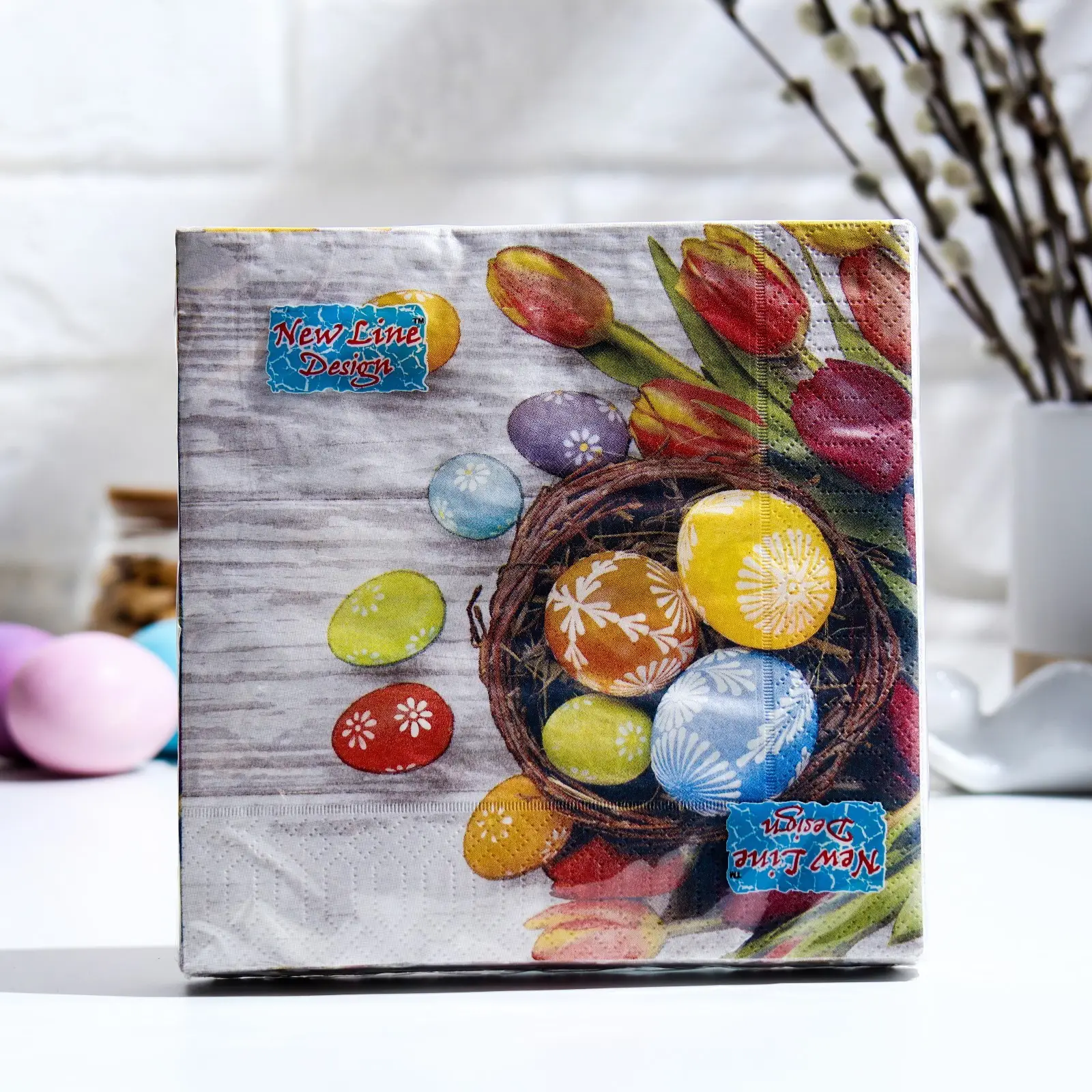Салфетки бумажные New Line Design (33*33 3 слоя) "Пасха Яйца тюльпаны", 20 листов.
