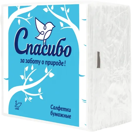 Бумажные салфетки «Спасибо за заботу о природе» изготовлены из 100% вторичного сырья. Современные технологии позволяют создать из восстановленного целлюлозного волокна такую же привычную белую салфетку с отличными впитывающими свойствами. Однослойные бумажные салфетки «Спасибо за заботу о природе» подойдут, как для личной гигиены, так и для сервировки стола и хозяйственно-бытового использования. Покупая продукцию из вторичного сырья, вы вносите свой вклад в сохранение лесов и планеты.