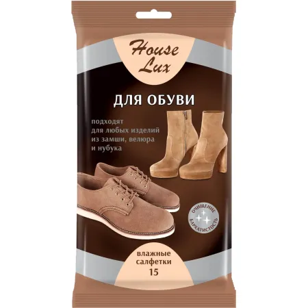 Влажные салфетки торговой марки House Lux разработаны специально для придания безупречного вида вашей обуви. Салфетки предназначены для ухода за обувью из замши, велюра и нубука. Компоненты, входящие в состав пропитывающего лосьона, эффективно удаляют пыль и загрязнение. Для тех, кто носит обувь на белой подошве актуален вопрос - Как вернуть первозданную белизну на любимой обуви? Способов достаточно много, они требуют времени и много подручных средств. Влажные салфетки для обуви помогут Вам быстро решить эту проблему.