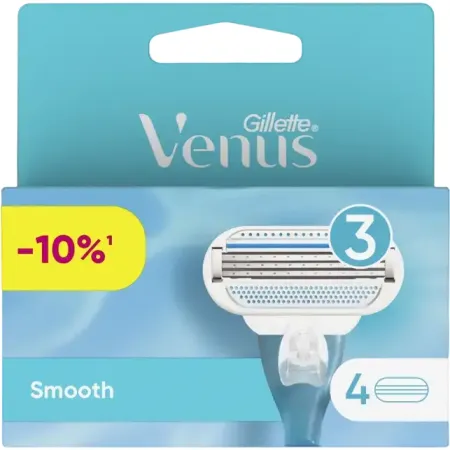 Сменные кассеты для женской бритвы Venus Smooth, в упаковке 4 шт. Благодаря трем повторяющим изгибы тела лезвиям и разглаживающим кожу защитным подушечкам вокруг лезвий бритва обеспечивают гладкое и чистое бритье одним движением.