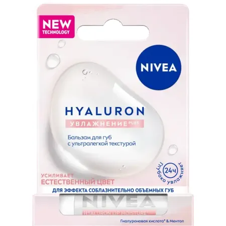 Бальзам для губ с ультралегкой текстурой Hyaluron Увлажнение PLUS от NIVEA с гиалуроновой кислотой и ментолом. Обогащённая Гиалуроновой кислотой и ментолом обволакивающая текстура бальзама наполняет губы влагой, подчеркивает естественный нежно-розовый цвет.