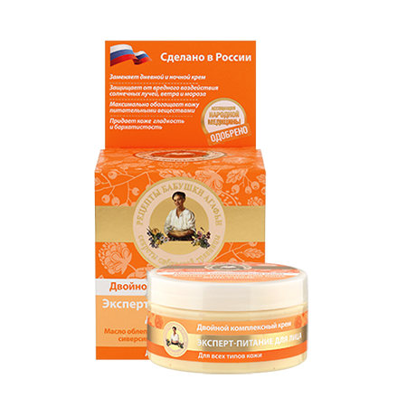 Двойной крем эксперт-питание - это натуральное универсальное средство, созданное по рецептам сибирской травницы Агафьи, сочетающее в себе комплексный дневной и ночной уход. Его роскошная насыщенная текстура глубоко питает и смягчает кожу, дарит ей ослепительную красоту и нежность. Масло облепихи алтайской обладает невероятно питательными свойствами, в нем содержится 8 витаминов, 18 аминокислот и 24 минерала, оно оказывает мощное тонизирующее действие, смягчает кожу, придает ей мягкость и бархатистость. Экстракт горной сиверсии и биокомплекс Омега 3,6,9 глубоко восстанавливают и омолаживают кожу, активизируют процессы регенерации, заметно сокращая морщины, повышают упругость и эластичность.