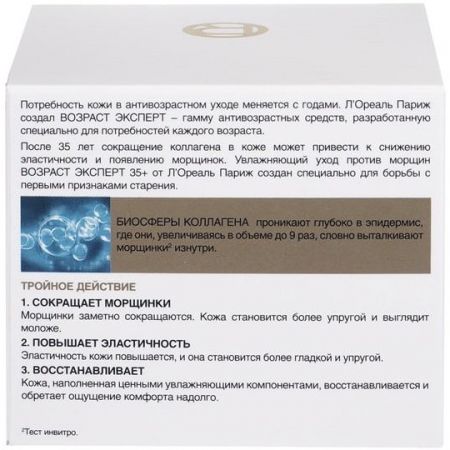 Основная проблема кожи после 35 лет — это понижение уровня коллагена, как следствие — появление морщин. Ночной крем для лица ВОЗРАСТ ЭКСПЕРТ 35+ эффективно борется с первыми признаками старения. Формула средства повышает упругость кожи и интенсивно корректирует морщины благодаря Биосферам коллагена, которые проникают в глубинный слой эпидермиса и увеличиваются в 9 раз, выталкивая морщины изнутри.