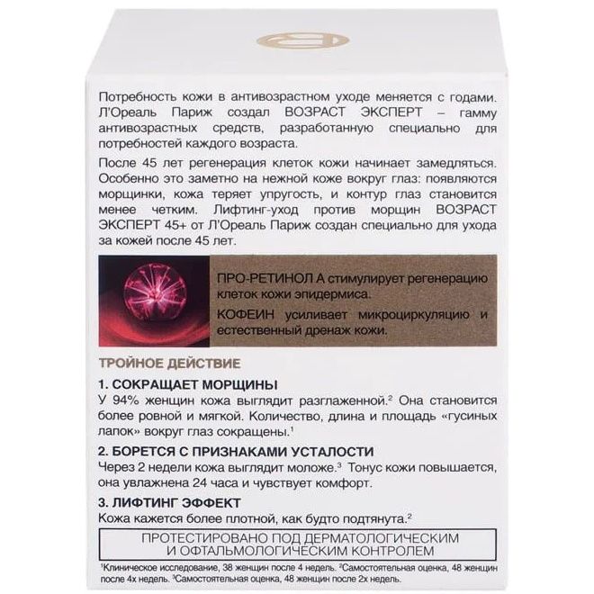 Лифтинг-уход вокруг глаз ВОЗРАСТ ЭКСПЕРТ 45+ от L’Oreal Paris создан специально для ухода за кожей после 45 лет. Действие уникальной формулы с активными компонентами направлено на ускорение восстановления клеток кожи и возвращение ей упругости и тонуса:
