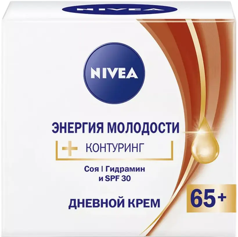 Дневной крем «Энергия молодости 65+» от NIVEA укрепляет и восстанавливает контуры лица, интесивно увлажняет, заметно уменьшает даже глубокие морщины и повышает упругость кожи. Он обогащен энергетическим коктейлем из гидрамина и экстракта сои, а солнцезащитный фактор SPF 30 предотвращает появление пигментных пятен. Для достижения оптимального результата используй в сочетании с ночным кремом «Энергия молодости 65+» от NIVEA.
