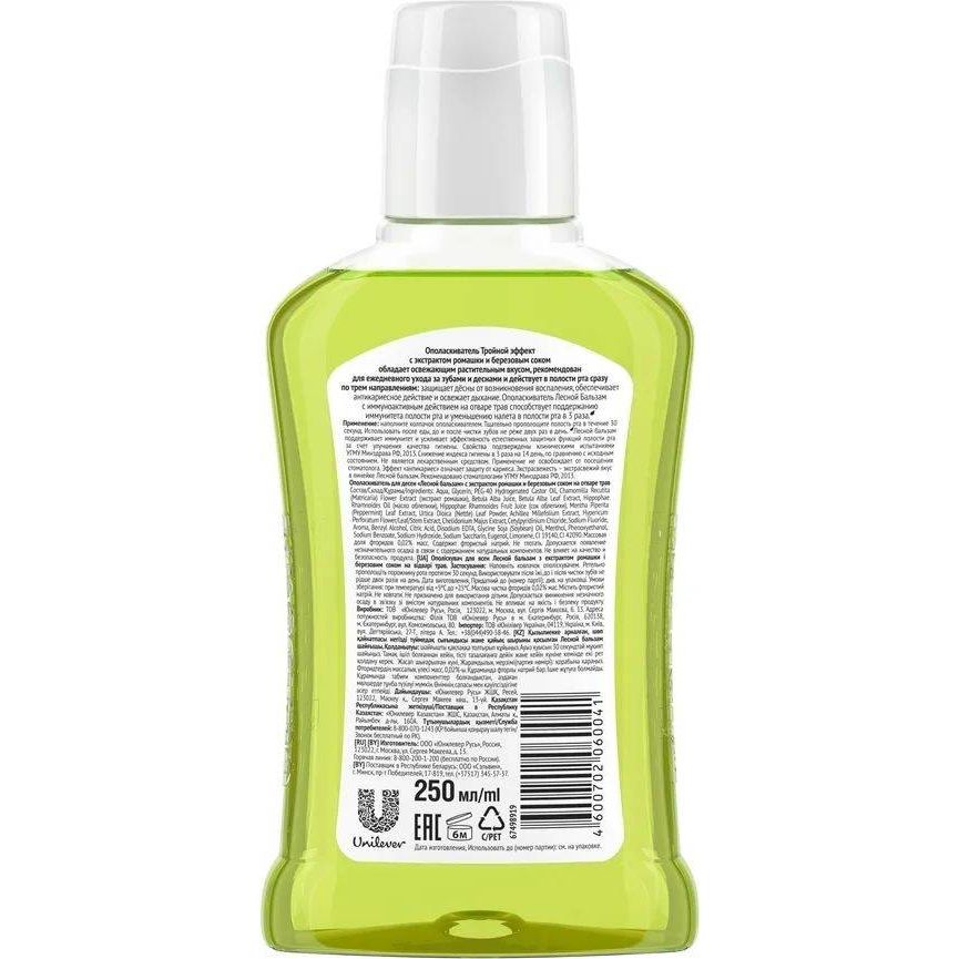 Ополаскиватель «Тройной эффект» с ромашкой имеет мягкий травяной вкус и сочетает в себе сразу 3 действия, позволяя достичь максимальной защиты всей полости рта: