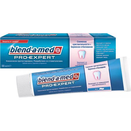 Blend-a-med "PRO-EXPERT. Снижение чувствительности и бережное отбеливание" позволяет достичь сразу двух эффектов при использовании одной зубной пасты: оказывает направленное действие против причин повышенной чувствительности зубов и бережно удаляет пигментированный налет для поддержания естественной белизны улыбки. Воздействуя на дентинные канальцы, Blend-a-med "PRO-EXPERT. Снижение чувствительности и бережное отбеливание" "запечатывает" их и защищает от эрозии эмали. Эта паста имеет нежнейшую консистенцию с мятным вкусом.