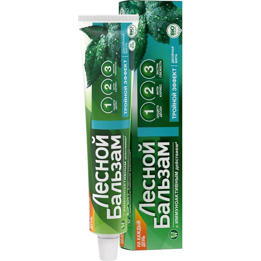Профилактическая зубная паста Лесной бальзам Тройной эффект с мятой сочетает в себе сразу 3 действия, позволяя достичь максимальной защиты всей полости рта: укрепляет десны, защищает от кариеса, сохраняет дыхание свежим в течение дня. Зубная паста бережно очищает эмаль за счет природного абразива - диоксида кремния (Silica). Диоксид кремния имеет округлую форму частиц и не царапает эмаль в процессе чистки зубов, при этом позволяет добиться равномерного удаления налета по всей поверхности зубов.