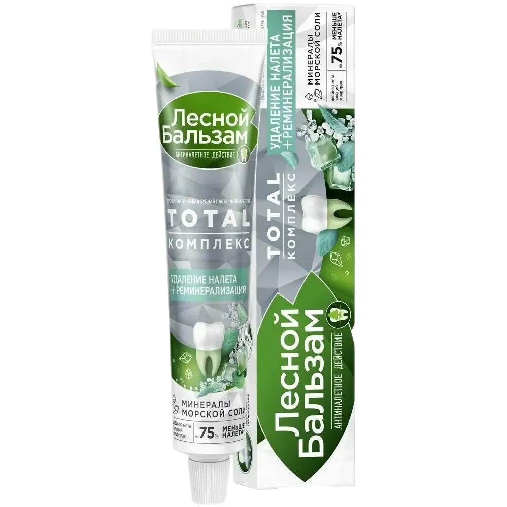 Попробуйте новую зубную пасту Лесной бальзам Тotal Комплекс с морской солью, маслом мяты, отваром трав и кальцием. Формула зубной пасты усилена минеральными компонентами: морская соль защищает от бактерий и помогает предотвратить разрушающее действие налета на эмаль зубов, а кальций восстанавливает зубную эмаль. Отвар трав и масло мяты оказывают противовоспалительное и укрепляющее действие на десны. Бережное очищение эмали происходит за счет абразива природного происхождения – диоксида кремния, который имеет округлую форму частиц и не царапает эмаль в процессе чистки, при этом позволяет добиться равномерного удаления налета по всей поверхности зубов. Зубная паста не содержит парабенов и химических отбеливателей, обладает свежим мятным вкусом и рекомендована стоматологами для ежедневной защиты зубов и десен.