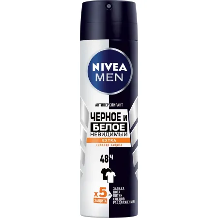 Антиперспирант спрей «Невидимый Extra» из линейки NIVEA MEN «Черное и Белое» надежно защищает тебя и твою одежду. Он обеспечивает защиту 5 в 1: от запаха, пота, пятен, следов и раздражения, и дарит коже приятное ощущение свежести в течение всего дня. Не оставляет никаких белых пятен на твоей черной одежде или желтых пятен на твоей одежде. Получи надежную защиту на 48 часов, которая заботится о твоей коже. Дерматологически протестировано.