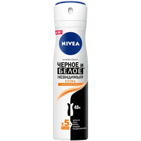 Дезодорант-антиперспирант спрей Nivea «Невидимый для чёрного и белого Extra» предотвращает появление белых пятен на темной одежде и желтых пятен на светлой одежде. Черная одежда остается черной, а белая одежда дольше остается белой. Уникальная формула имеет 5 факторов защиты: от запаха, пота, пятен, следов и раздражения. Защищает кожу подмышек в течение 48 часов от пота и неприятного запаха.
