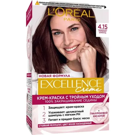 | Полное название оттенка: 4.15 Морозный Шоколад Текстура: кремовая Тип краски: стойкая аммиачная | Эффект: стойкий цвет, упругость, закрашивает до 100% седины Тип волос: для всех типов волос Серия: Excellence |