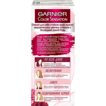 Garnier Color Sensation — суперстойкая крем-краска для волос. Формула включает природные компоненты. Они обеспечивают бережное воздействие на локоны и уход. Волосы будут выглядеть шелковистыми и блестящими. Средство идеально маскирует седину и осветляет до 4 тонов. В инструкции описаны шаги для самостоятельного использования краски. В наборе также имеются проявляющее молочко и крем для ухода после процедуры.