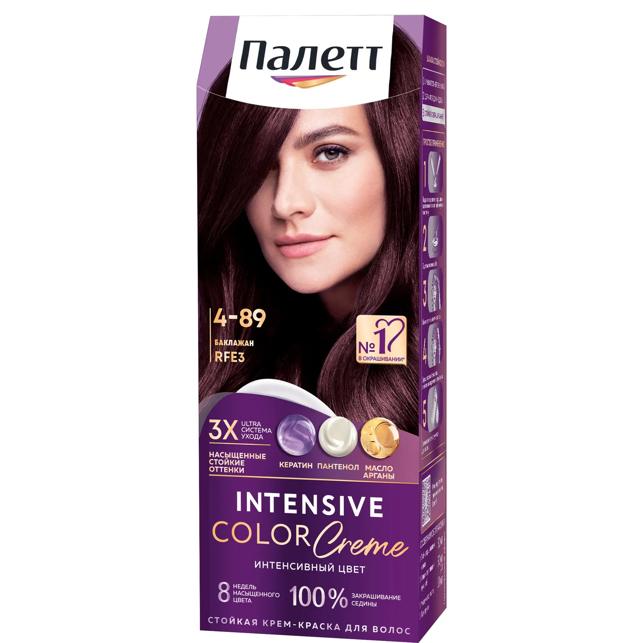 Благодаря тройной системе ухода с Кератином, Пантенолом и Аргановым маслом, стойкая крем-краска Палетт «Интенсивный цвет» становится идеальным помощником в достижении красоты, силы и здоровья ваших волос. Формула с высокоинтенсивными пигментами проникает глубоко внутрь волоса, защищая цвет от вымывания и обеспечивая 100% закрашивание седины. Сильные, гладкие и поразительно блестящие волосы!