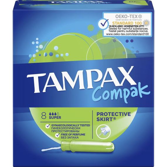 Компактные тампоны TAMPAX Compak Super обеспечивают надежную защиту при умеренных и интенсивных менструальных выделениях. Они снабжены гладким компактным аппликатором, поэтому их так удобно взять с собой, и защитной юбочкой, которая помогает предотвратить протекания на срок до восьми часов, обеспечивая надежную защиту TAMPAX. Ощущайте чистоту и полную свободу действий.