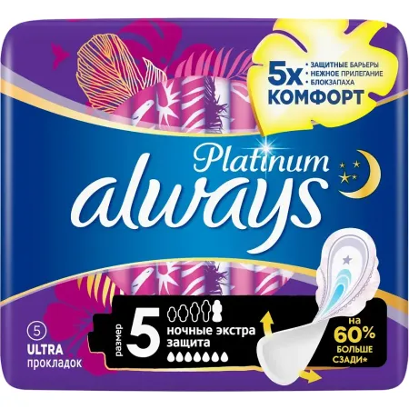 Гигиенические прокладки Always Platinum обеспечивают лучшее сочетание комфорта и защиты среди прокладок Always. Always Platinum более комфортны (по сравнению с Always Ultra) благодаря тысячам микроподушечек и новым, мягким как шелк крылышкам. Они также обеспечивают лучшую защиту (по сравнению с Always Ultra) благодаря защитным боковым барьерам и ультравпитывающему внутреннему слою, который запирает влагу внутри. Always Platinum Secure Night (Размер 5) с крылышками рекомендованы для ночного использования, благодаря удлиненной на 60% задней части (по сравнению с Always Platinum Размер 2).