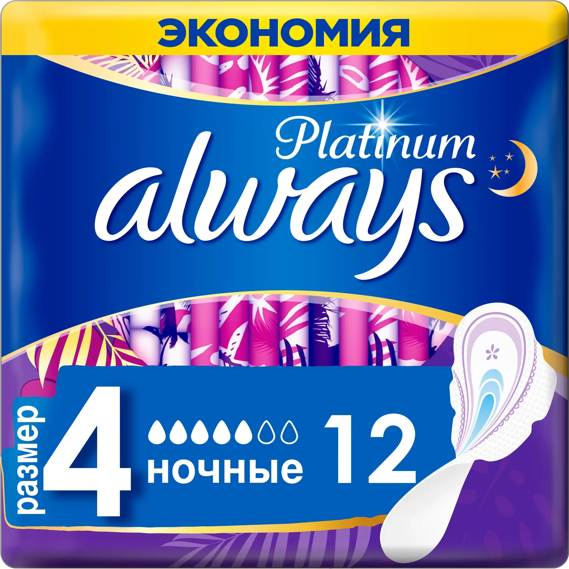 Always Platinum более комфортны (по сравнению с Always Ultra) благодаря тысячам микроподушечек и новым, мягким как шелк крылышкам. Они также обеспечивают лучшую защиту (по сравнению с Always Ultra) благодаря защитным боковым барьерам и ультравпитывающему внутреннему слою, который запирает влагу внутри. Always Platinum Ночные (Размер 4) с крылышками рекомендованы для ночного использования или для дневного использования при обильных выделениях.