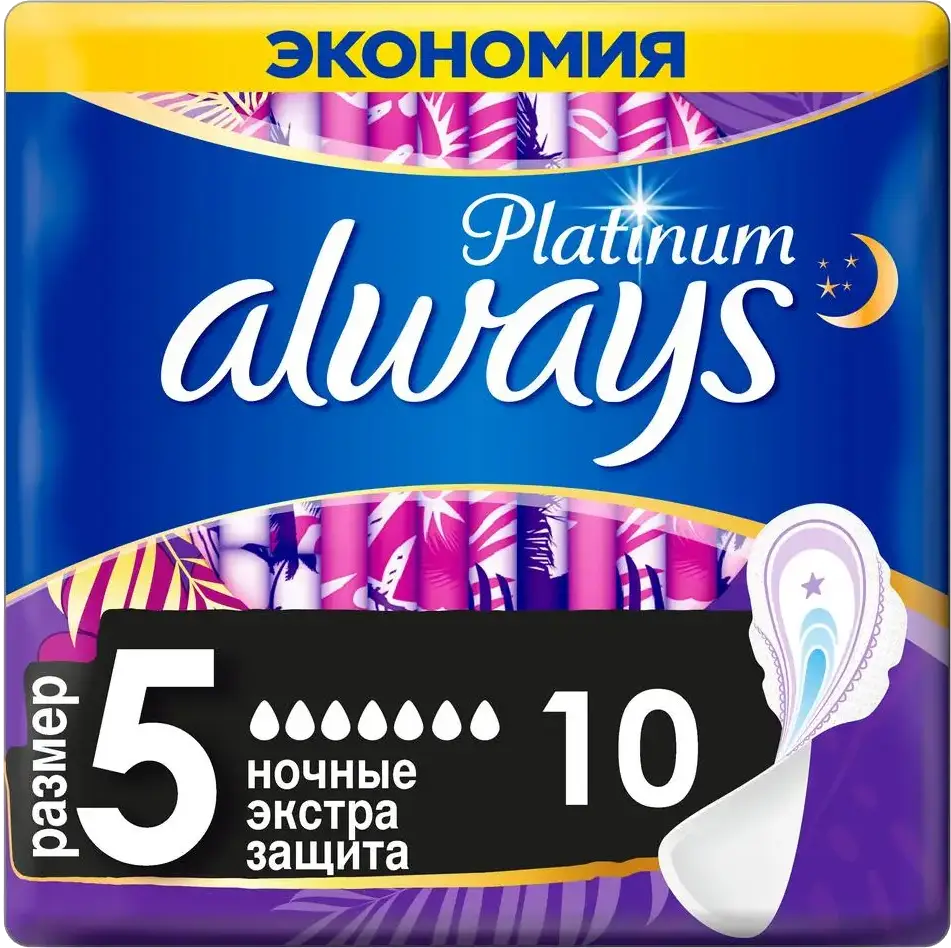 Гигиенические прокладки Always Platinum обеспечивают лучшее сочетание комфорта и защиты среди прокладок Always. Always Platinum более комфортны (по сравнению с Always Ultra) благодаря тысячам микроподушечек и новым, мягким как шелк крылышкам. Они также обеспечивают лучшую защиту (по сравнению с Always Ultra) благодаря защитным боковым барьерам и ультравпитывающему внутреннему слою, который запирает влагу внутри. Always Platinum Secure Night (Размер 5) с крылышками рекомендованы для ночного использования, благодаря удлиненной на 60% задней части (по сравнению с Always Platinum размер 2).