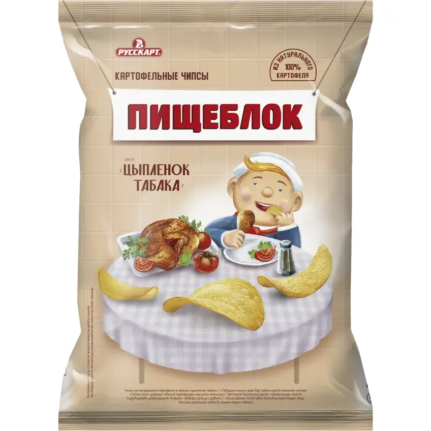 Пробуем «Пищеблок»! Тончайшие хрустящие ломтики чипсов из 100% натурального картофеля! Чипсы производятся на самом крупнейшем ультрасовременном заводе в России, а собственная селекция картофеля «чипсовых» сортов гарантирует непревзойденное качество продукции. Каждая упаковка — это ностальгия и вкус, который возвращает в те беззаботные дни. Давайте отправимся в путешествие воспоминаний вместе!Чипсы со вкусом цыпленка табака — это просто находка для гурманов. Ароматная курочка со специями + хрустящий картофель!