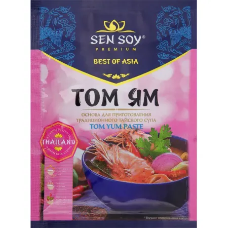 В основе для супа Sen Soy «Том Ям» собраны все главные приправы и специи для создания настоящего тайского супа. Сложный микс кокосового молока, рыбного соуса, тамаринда, лемограсса, галангала и других ароматных трав создают контраст вкусов от легкой сладости до жгучей остроты. Ваша задача лишь добавить свежие ингредиенты: креветки, грибы, помидоры и зеленый лук. Через полчаса достойный восхищения том ям - на вашем столе!
