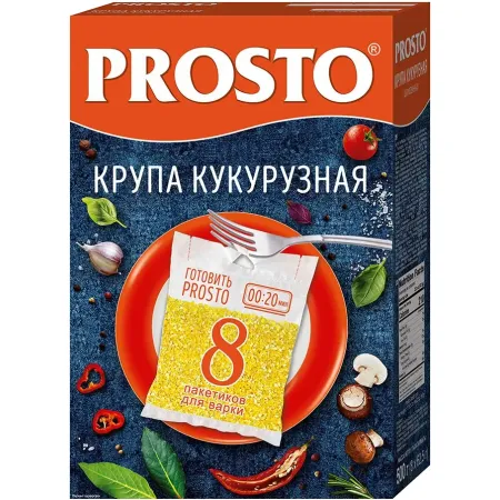 Кукурузная крупа ТМ «Prosto» производится согласно стандартам ГОСТ. Содержит полезные микроэлементы и сохраняет все свои полезные свойства в процессе варки.
