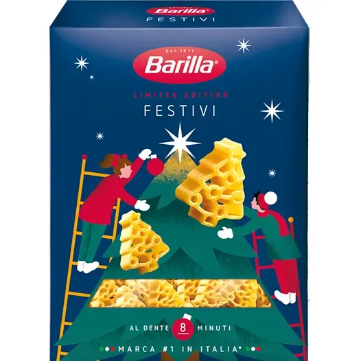 Уникальная фигурная паста Barilla Festivi в форме изящных елочек поможет создать атмосферу торжества и уюта за столом, даря праздничное настроение всей семье. Шероховатая текстура пасты Festivi превосходно удерживает соус, поэтому Вы можете порадовать свою семью блюдами различной сложности. Рекомендуем попробовать эту пасту в сочетании с классическим песто Дженовезе или томатным соусом Базилико. Станьте ближе друг к другу этой зимой вместе с Barilla!