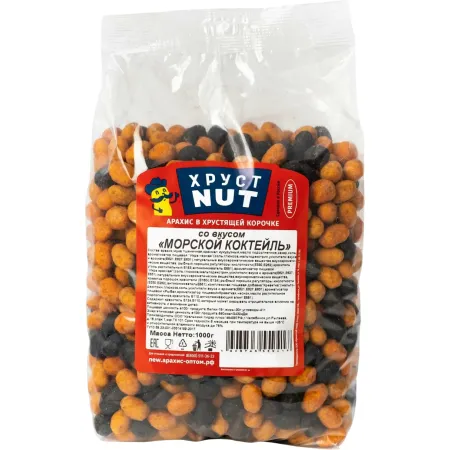 Арахис ХрустNut в хрустящей корочке со вкусом морского коктейля. Сочетание нежной хрустящей корочки и жареного арахиса - это отличный вкус и полезный перекус! Утоляет чувство голода, заряжает энергией и дарит хорошее настроение. Большая упаковка для дружной компании!