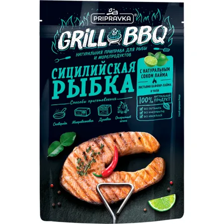 Приправа «Сицилийская рыбка» с соком лайма и чили для рыбы и морепродуктов. Универсальный способ приготовления: сковорода, микроволновка, духовка, открытый огонь (мангал, гриль). Можно использовать круглый год. ТМ «ПРИПРАВИЯ» гарантирует высокое качество и пищевую безопасность продукта.