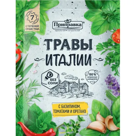 Приправа «Травы Италии» с характерным для Италии вкусом чили, базилика, орегано, тимьяна, майорана, мяты непревзойденно дополненный ароматным чесноком и кориандра порадует самого искушенного кулинара.