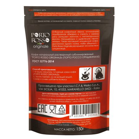 Кофе растворимый Московская кофейня на паяхъ «Porto Rosso Original», 150 г.