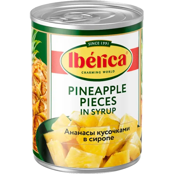 Отборные ананасы Iberica кусочками в сиропе – это спелые, тщательно отобранные фрукты, нарезанные и залитые лёгким сахарным сиропом. Ананасы - это натуральное и низкокалорийное лакомство с содержанием полезных минералов и витаминов. Прекрасно сочетаются с курицей, входят в состав мясных блюд, используются в приготовлении десертов – тортов, фруктовых салатов, подаются с мороженым и в составе коктейлей. К тому же, сочная мякоть кисловатого ананаса в сладком сиропе – великолепный освежающий десерт.