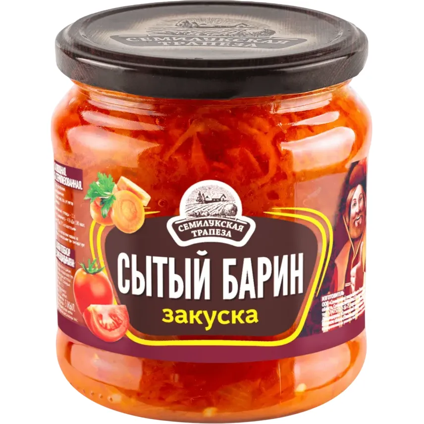 В составе закуски «Сытый барин» марки «Семилукская трапеза» только спелые мясистые перцы, сочная морковь и лук, в заливке из томатной пасты и преправленные душистый специями. Такая закуска придётся по вкусу всем любителям лечо. Подавайте «Сытый барин» в красивой пиале на праздничный стол и ваши гости будут в восторге!