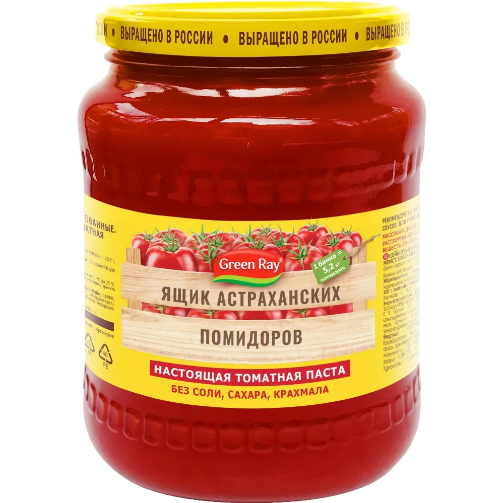 Ярко-красный цвет, аромат спелых помидоров, густая консистенция — все это говорит о качестве настоящей томатной пасты. В нашей пасте нет ничего кроме помидоров: ни соли, ни сахара, ни крахмала. На изготовление 1 кг томатной пасты уходит целых 7 кг астраханских помидоров. Таким образом, в большой баночке чуть больше 5 кг — а это целый ящик астраханских помидоров!