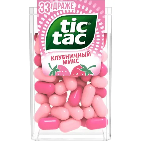 Tic Tac — освежающие драже для мягкого освежения в удобной упаковке. В каждом драже более 100 слоёв уникального вкуса. Tic Tac «Клубничный Микс» - это сочное сочетание спелой клубники и мятной свежести! Идеально подходит для освежения в любое время.