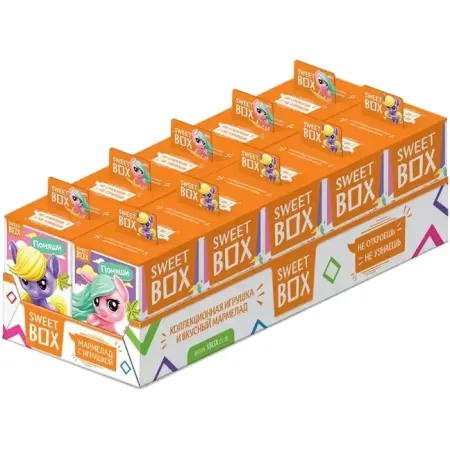 В каждой коробочке вкусный мармелад с натуральным фруктовым соком, лифлет с описанием персонажа и большая коллекционная игрушка.