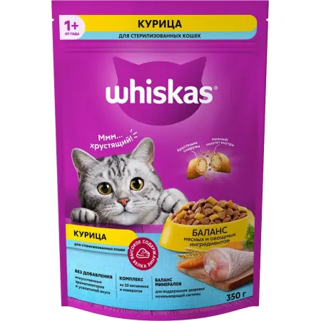 Сухой корм для стерилизованных кошек Whiskas «С курицей и вкусными подушечками», 350 г.