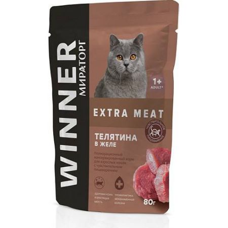 Корм консервированный полнорационный для взрослых кошек с чувствительным пищеварением Winner Extra Meat «Телятина в желе», 80 г.
