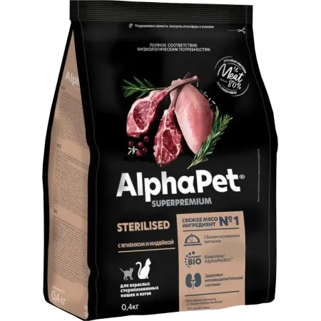 Сухой корм для стерилизованных кошек AlphaPet Superpremium «Ягненок с индейкой», 400 г.