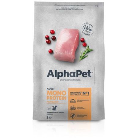 Сухой корм для взрослых кошек AlphaPet Superpremium Monoprotein С индейкой, 3 кг.