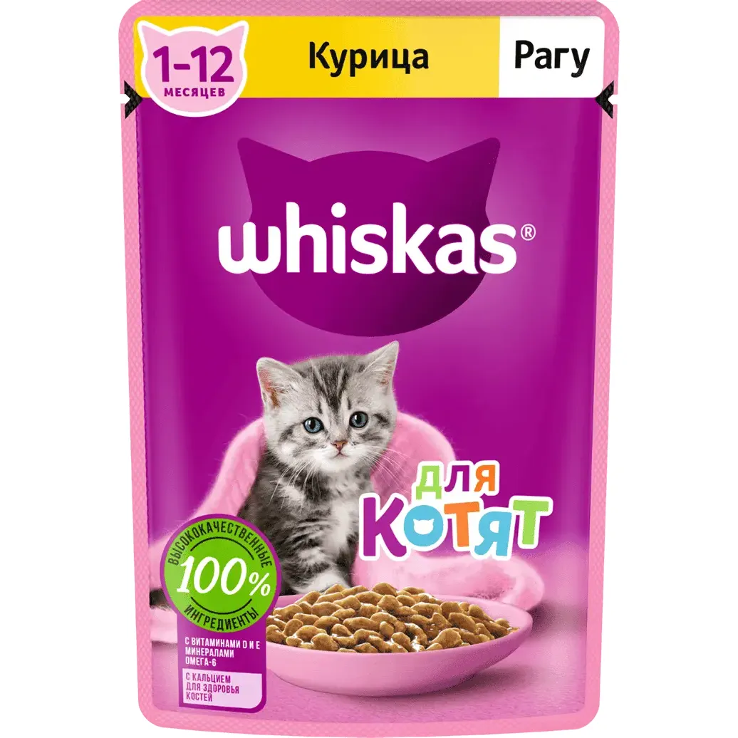 Рацион Whiskas для котят «Рагу с курицей» — это сбалансированный рацион для здорового роста вашего малыша. Котенок с удовольствием попробует маленькие нежные кусочки с курицей в ароматном соусе. Все для замурррчательной жизни! Рационы Whiskas для котят позаботятся об иммунитете, поддержат здоровое пищеварение и обеспечат здоровый рост и развитие. Котята активно растут и с первых дней нуждаются в правильном питании.