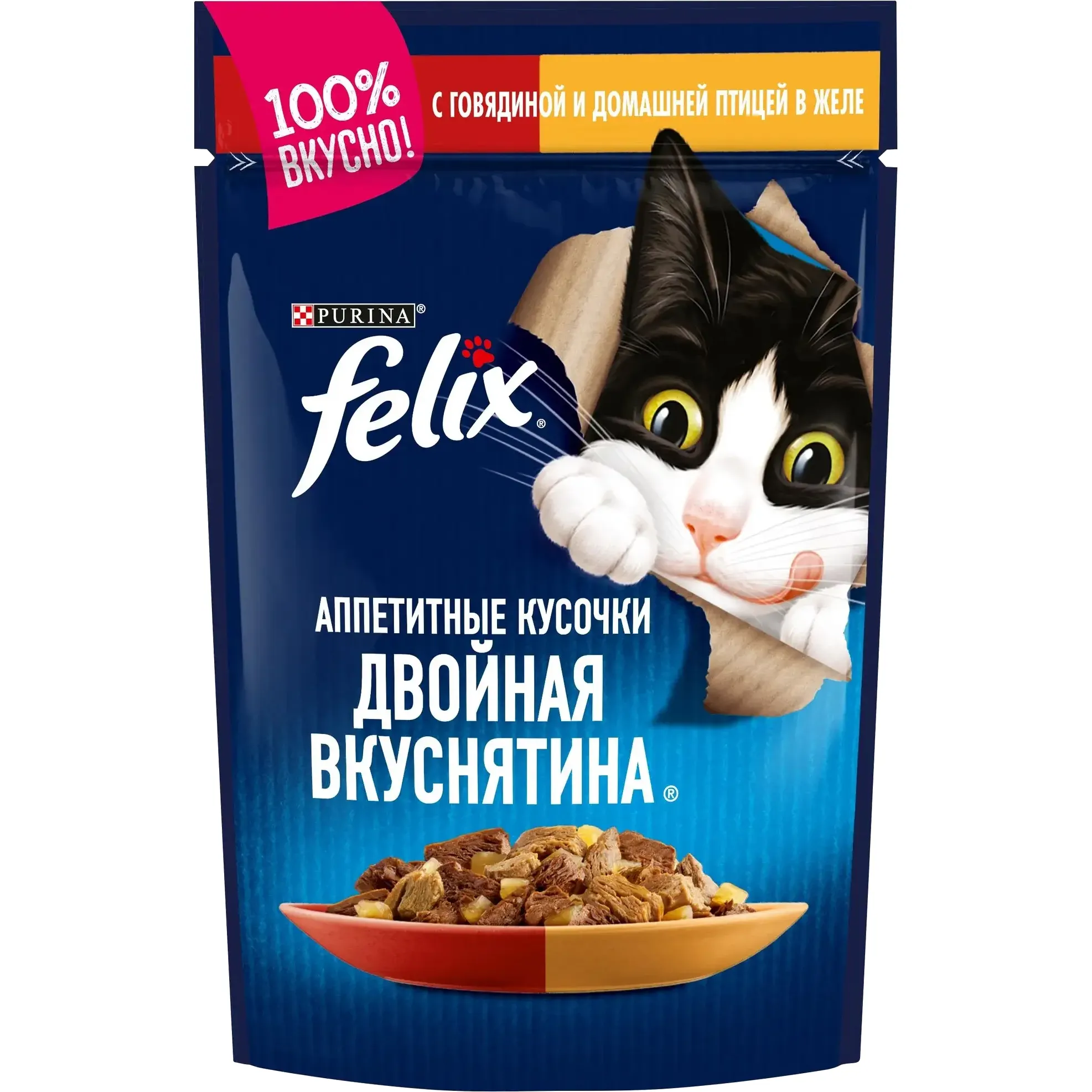 Влажный корм для кошек Felix Двойная Вкуснятина «Говядина и птица в желе», 85 г.