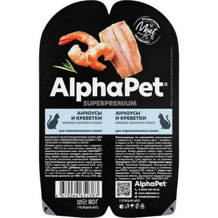 Влажный корм для взрослых стерилизованных кошек AlphaPet Superpremium «Анчоус и креветки в соусе», 80 г.