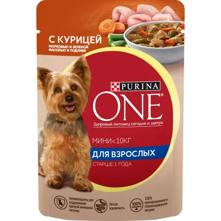 Влажный корм для взрослых собак мелких пород Purina One Мини «Курица с морковью и зеленой фасолью в подливе», 85 г.