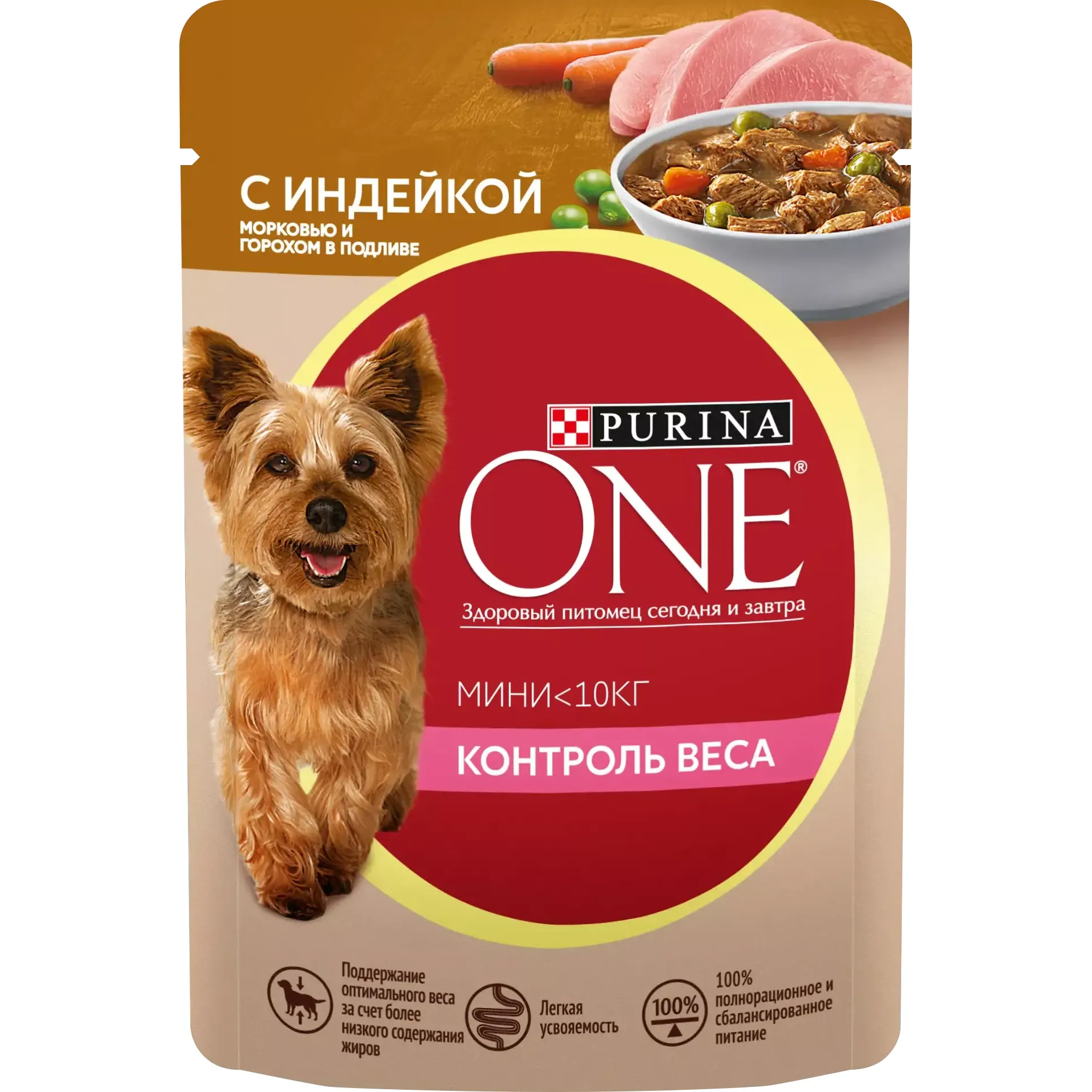 Влажный корм для собак мелких пород Purina One Мини Контроль веса «Индейка с морковью и горохом в подливе», 85 г.